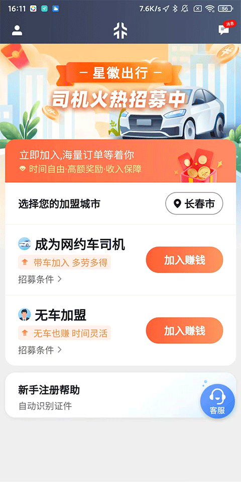 1、通过招募链接注册-确认接单城市-选择“加盟方式”-查看招募条件-点击“加入赚钱";