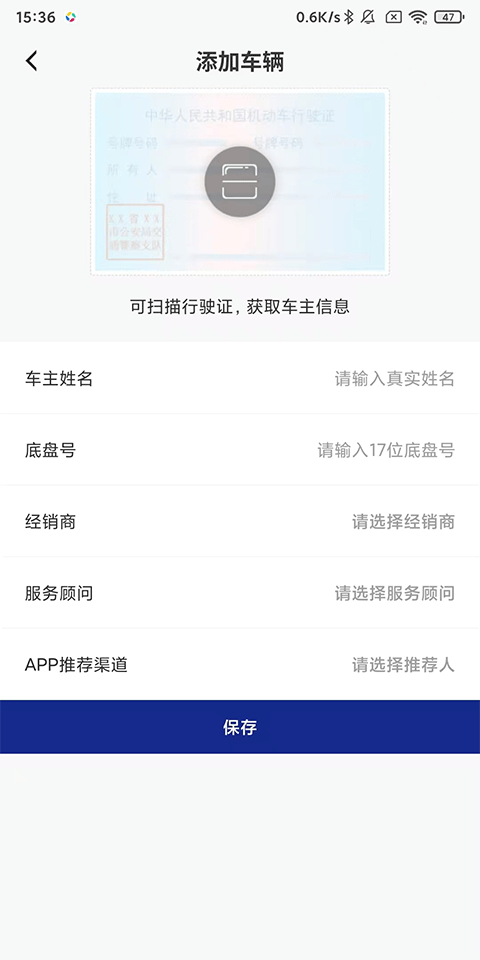 2、扫描行驶证,获取车主信息;或在下方手动输入车主车辆信息,点击【保存】即可。