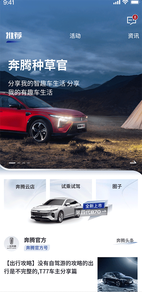 奔腾YOMI是一款专为奔腾车主打造的一站式汽车服务应用,它不仅能让用户在线购车、查询经销商、预约试驾,还能获取最新车型资讯,满足从选车到用车的全流程需求。平台还汇聚了海量汽车相关内容,方便用户随时查阅品牌动态和产品信息。