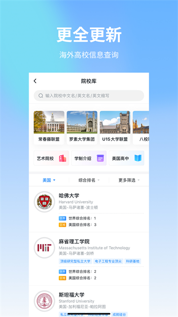 汇集全球高校权威排名,实时跟踪最新排名信息,多维度评价院校,打破信息不对称, 一站式搞定查名校与优势专业信息!