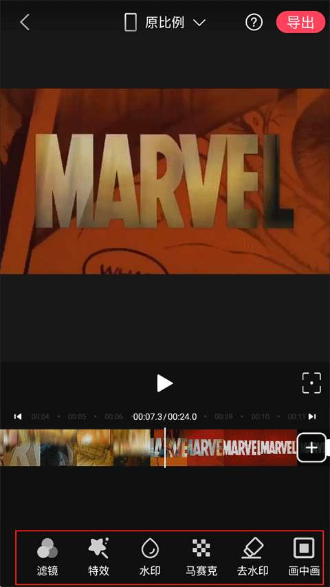 5、往左滑动还有滤镜、特效、水印、马赛克、去水印以及画中画等;