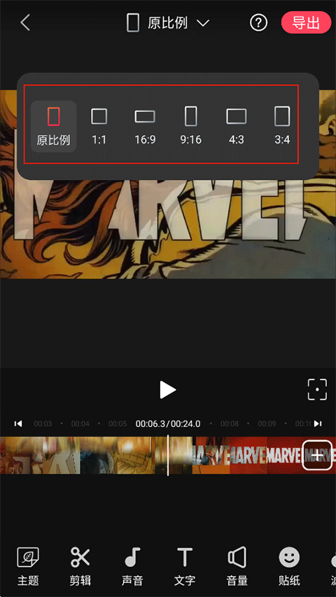 4、下方提供了主题、剪辑、声音、文字、音量、贴纸功能...