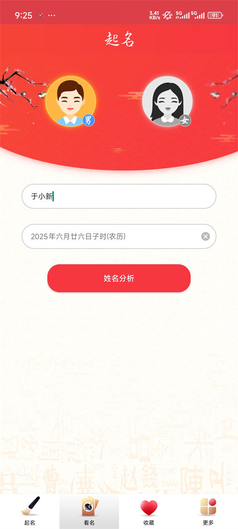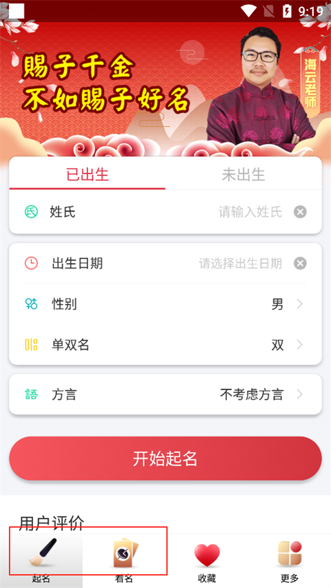 1、打开软件,在主页有【取名、看名两大板块】完善姓氏、出生、性别等信息,点击开始起名