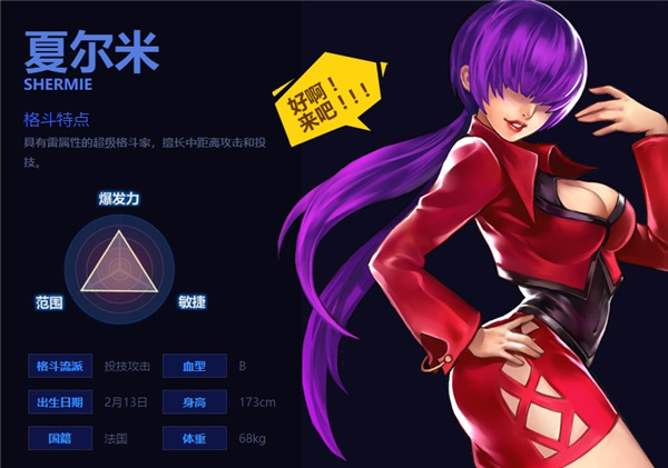 特点:近战角色,八神流古武术,连击狂野残暴、爆发力强。