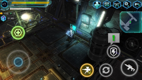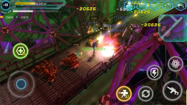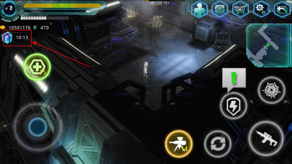 这款游戏的操作不是很难,进入游戏后玩家可以看到界面左下角有个圆环按钮,这个按钮是用来控制角色移动的,玩家想让角色往哪个方向移动就按住该按钮向哪个方向移动即可。玩家在移动的过程中要根据地面上绿色箭头的指示来,如果遇到异形生物的时候,玩家点击界面右下角带枪图标的按钮就可以发射子弹攻击目标,此外游戏中还提供了一个道具,那就是有黄色图标的机枪标志,当玩家点击该图标,就可以使用释放机枪塔自动攻击。