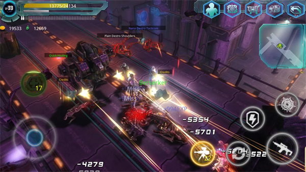 操作上也不难,左下角圆环按钮控制移动,右下角是攻击按钮,还有机枪塔可以自动攻击。技能方面有保护罩和爆炸形态,关键时刻能救命。血量低了可以用回血包,升级还能解锁新技能。