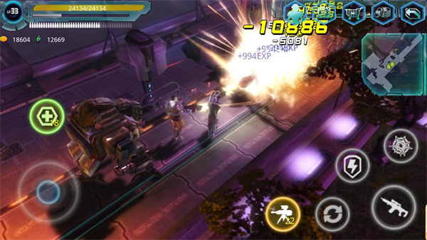毕竟是射击游戏那么角色受伤就不可避免,玩家可以通过界面左上角的黄色线条观察角色的血量情况,当血量低的时候点击界面左侧绿色的加号+回血包就可以为角色回复血量,如果血量为0时就意味着角色死亡,游戏失败,黄色线条下方的灰色线条是经验条,玩家给角色进行升级时恢复条带的增长并可以解锁新技能,该线条下方显示的是枪械的子弹数,子弹用完后可以恢复,但是玩家要注意在没子弹的情况下离敌人远点。