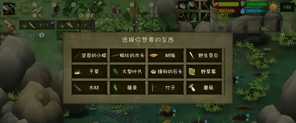 就检查陷阱、做任务、重做陷阱,哦!对了,做好两个竹叉一把弓,用来打狼(打不过多水里),萝卜齐了就菲利宾闯闯吧!还能够储存一些物品,有着足够的物资。