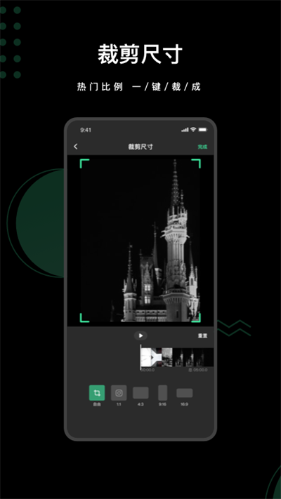 2、裁剪尺寸:裁剪视频尺寸大小,支持多种尺寸选择和自由裁剪。