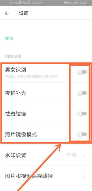 5、进入设置界面后,分别点击【男女识别、夜拍补光、祛斑祛痘和照片镜像模式】后面的【开启按钮】进入。如下图所示