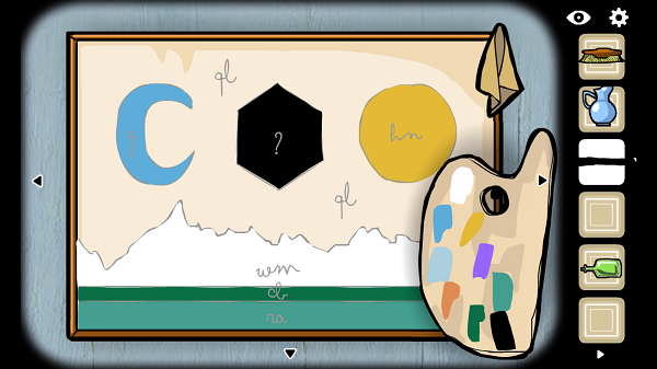 根据之前房间中找到的颜色和对应字母的线索:【浅蓝底+字母gl】【深绿色+字母d】【蓝底+字母g】【黄底+字母hn】【白底+字母wm】【绿底+字母na】 用【画笔】蘸取对应的【颜料】填图画作(不太好操作,点击颜料然后在相应的位置涂抹,直到系统自动填充满) 灰门-油画视角:最终如图填充完毕,最后用【黑色颜料】填充中间的【六边形】,得到【黑方块】