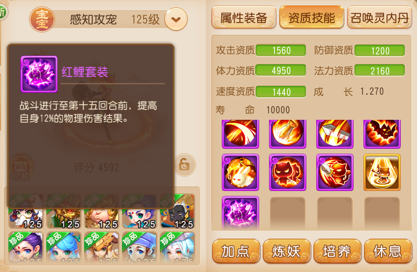 更何况在近期战斗平衡调整中,红鲤的套装效果还得到了增强,物理伤害结果提升的回合数有了显著变化,再搭配上强势的降防内丹“秋枫破”和“高级突进”技能,红鲤在全民攻宠中绝对是数一数二的暴力。