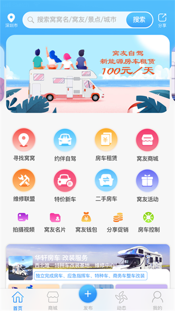 帮你轻松找到停房车、停拖挂、搭帐篷、卫生间、自来水、能接电、能做饭、能买菜、能钓鱼、能游泳的位置,窝友之家app,您的生活管家。