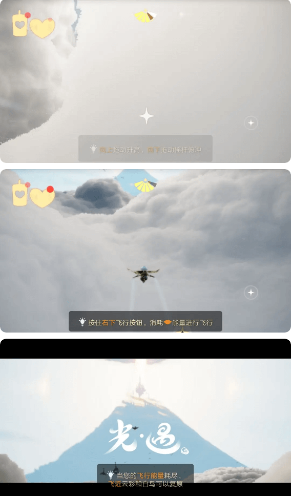 靠近云彩,鸟群回复能量,能量就是上方中间的分区。分区越多,能扇动斗篷的次数越多(我这时是六翼)