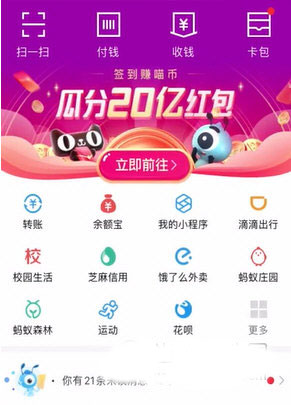 打开支付宝,在支付宝界面找到并点击“更多”。