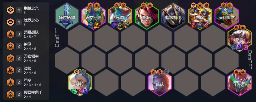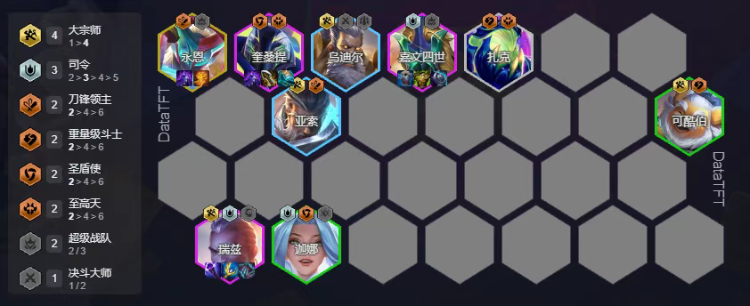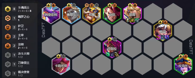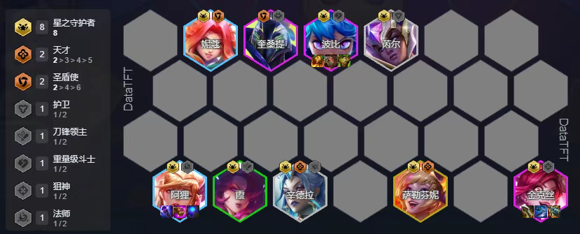 星守削弱了整体的加成,但依旧是强势热门大羁绊,这里我们用8星守搭配奎桑提,奎桑提的两条命机制可以让他在前排顶蛮久的,可以说是优质前排,有转的话可以下霞补其他