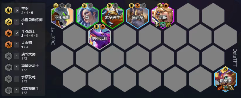 斗魂虽然昨天紧急热补,但还是能玩,而且十分适合新手上手的,阵容简单强势过渡丝滑,8斗魂能够提供大量属性和伤害加成,这里主C选择用莎弥拉,没来之前滑板鞋拿装备打工,副C格温,主坦为腕豪,副坦为赵信
