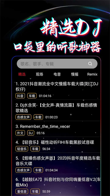 中文DJ舞曲、英文DJ舞曲、3D环绕舞曲,日韩舞曲、车载DJ、苏荷、喊麦、电音DJ、节奏、Remix、网络DJ、网络红歌,只有想不到,没有找不到。
