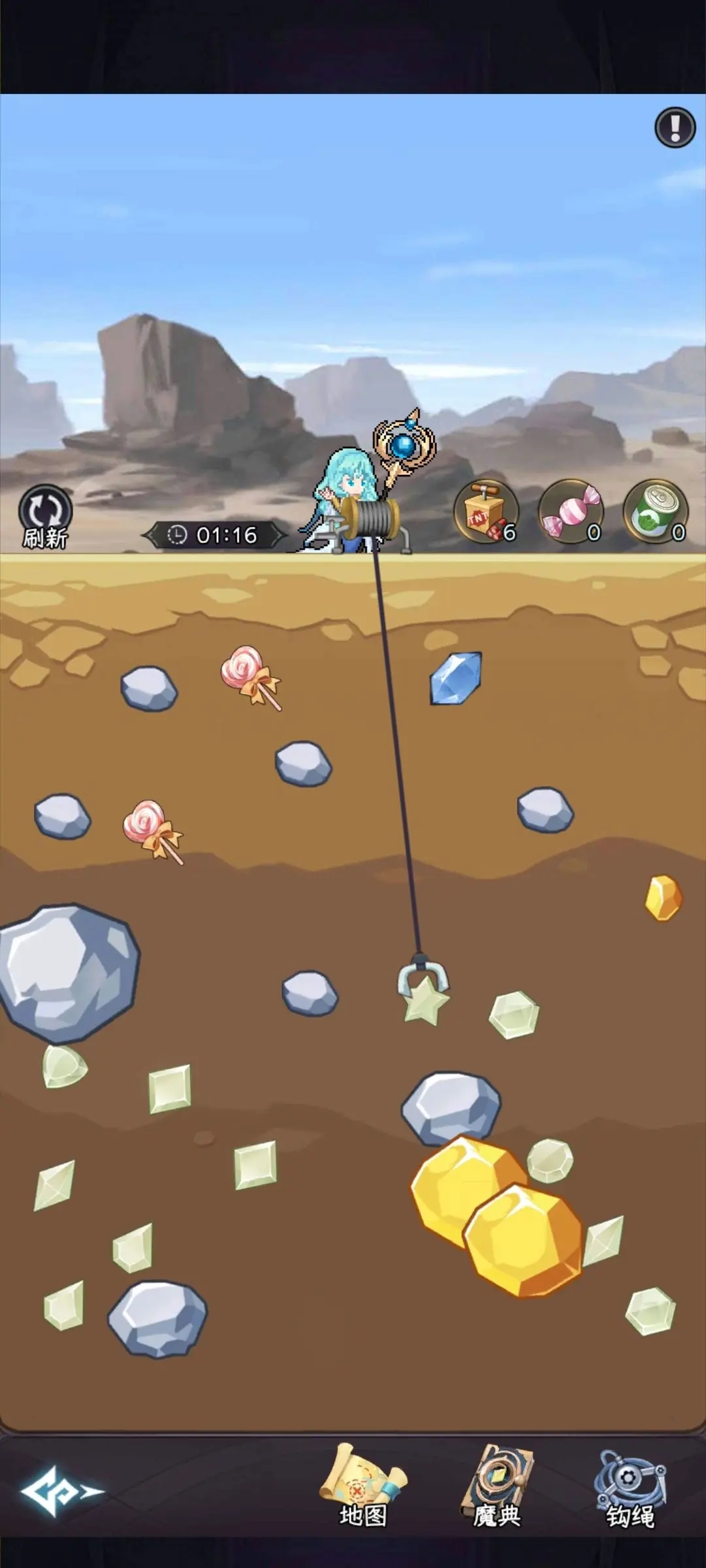 这里就不得不提这里就不得不提到必须得买的泰坦勾了,凑齐宝石套装给的属性加成非常给力,里面最宝贵的东西是宝石,其他的不是很重要,耐力值一小时恢复一点,没勾到东西,不会扣体力,糖果是扣60秒,炸弹,你把你勾的东西炸掉,也是会扣体力的哟,这个是氪金大佬专属的,因为他们赶时间勾搭没用的,直接就炸了,效率值是指你勾东西所需要的时间,前期不用那么看重,后期勾一个紫色宝石,得花一个多小时,但那起码都是一个月以后的事了。具体情况如下图