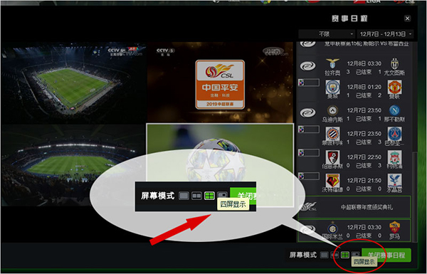 同时播放两场赛事视频,可用于同时播放四场四分之一赛事视频。