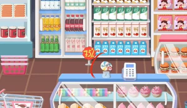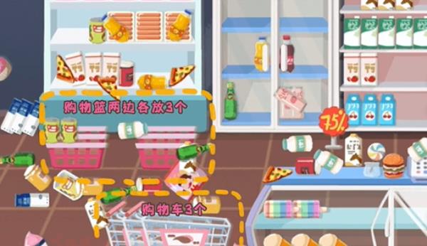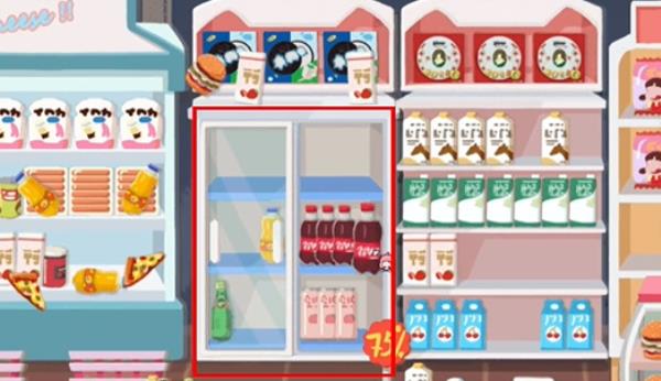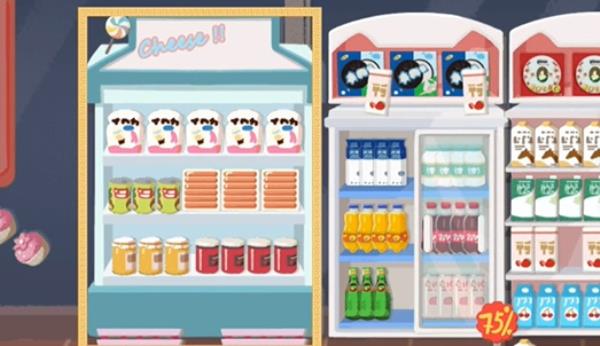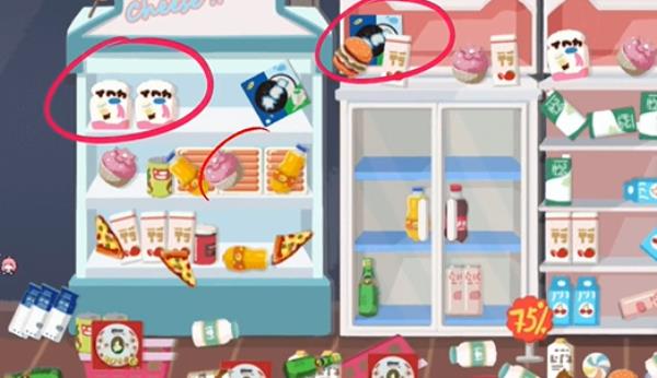 2、第二步:接着我们,注意最左边的冰箱和旁边的柜子上有这中已经放好了的零食,我们跟着把一样的零食放好就可以了。
