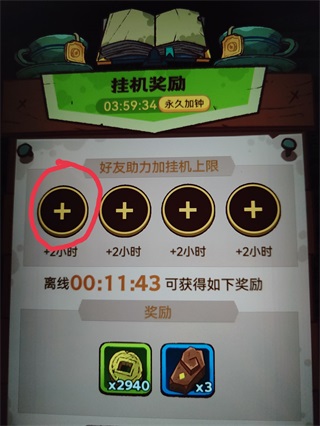 之后重点来了,怎么让小号加上大号,首先点击离线挂机奖励那里的加号,分享给自己的文件助手或者小号,然后切换到你的大号,再去点你刚刚分享的链接,这时候两个号就自动加上好友了