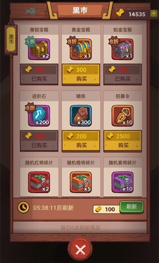 黑市每天都会刷新三种箱子,青铜黄金和铂金,青铜和铂金箱子是必买的,黄金箱子打折低于300再买(300买黄金箱子不是特别划算,但你金砖够想全买也没有问题)。其次提一嘴,进阶石每天也是必买的,后面会非常非常缺。黑市商店每天都会更新以及一次的免费刷新,之后每次刷新需要100金砖。根据你的vip等级会增加刷新次数。所以要怎么买,刷新几次黑市商店都是根据你的个人金砖够不够来的,普通微氪每天刷一两次就够了。