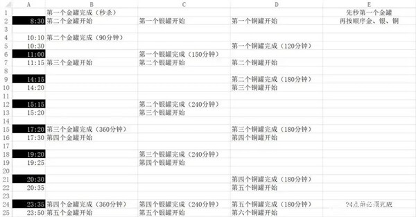 这是收罐攻略图,来自贴吧用户#810249134#的收罐时间安排攻略。早八到晚十一最大限度收罐,需要上线八次,属实是小肝,但收益非常高。