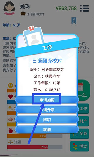 1、工作时间长了,也会升职加薪,但是也可以主动申请升职加薪,在游戏主界面,点击右边左下角的工作选项。如图所示