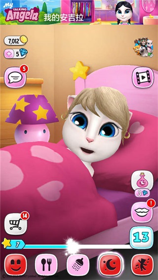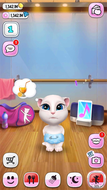 完成新手指引后,会开启每日任务,安吉拉吃东西、睡觉、上厕所、洗澡、刷牙、跳舞、睡觉完成后都能够增加它的经验。