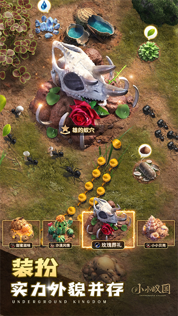 蚁巢布局自由选择,创造属于自己的美丽国度。你的眼光,决定蚁巢的品质:可以通过挖掘、开拓打造精美外观,蚁巢内的建筑布置,皆由你一手掌控。从小小蚁巢,到繁荣蚁国。