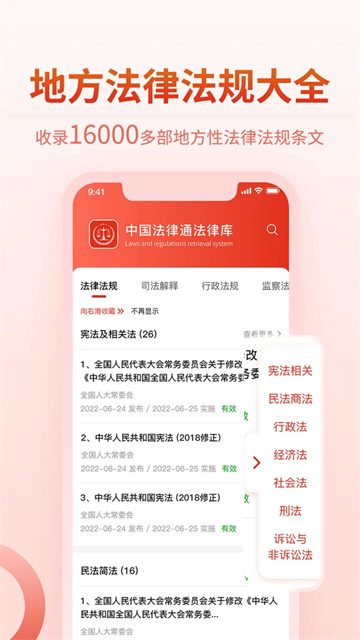 2、法律法规详细分类,一键查找。包含最高法颁布的全部法律法规大全及司法解释,能够方便地查阅相关的法律法规数据库中司法解释及案例。