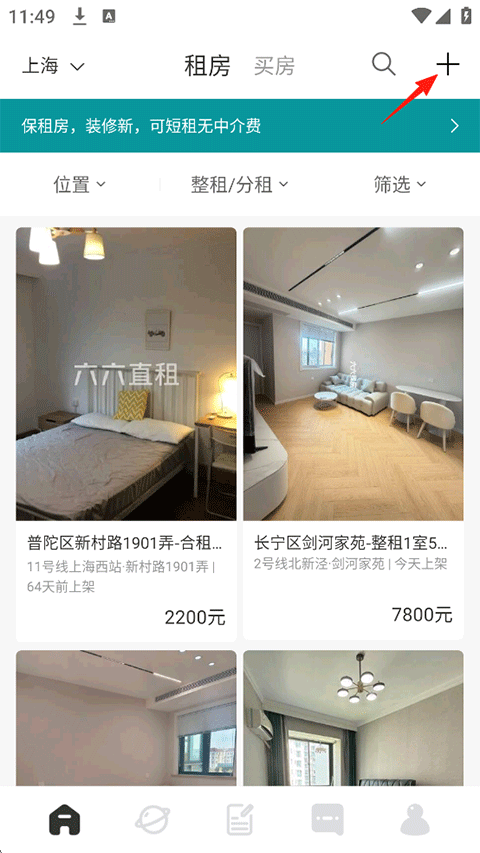 1、打开六六找房APP最新版,点击首页右上角的+按钮进入;