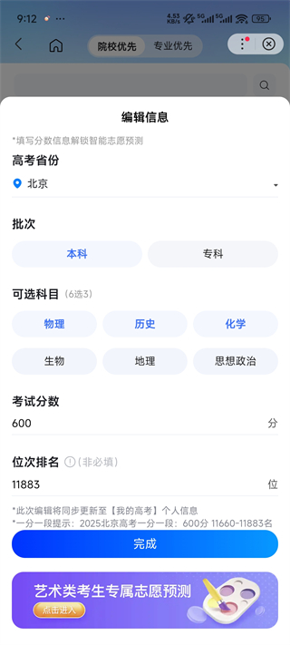 3、选择高考省份、选择批次、选择可选科目、输入考试分数点击【完成】。