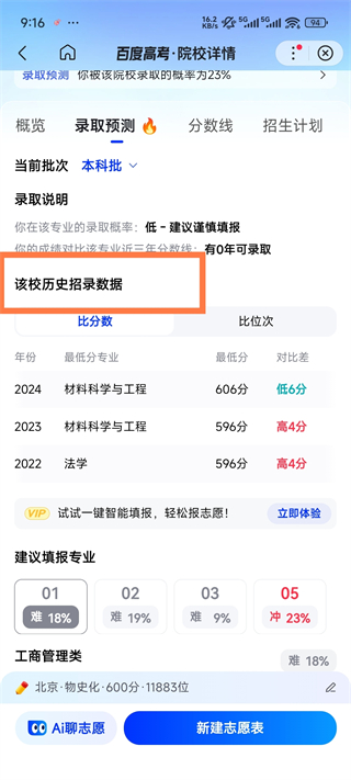 5、点击你心仪的学校,可以看到有该校历史招录数据。