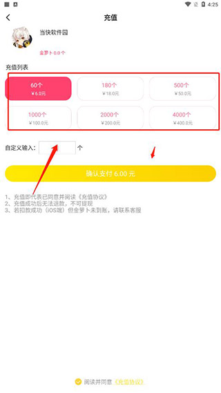 2、在充值列表中选择需要充值的数量,或者在自定义中输入个数,点击确认支付;