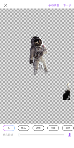 8、选择完成后,系统会自动将主体抠出来,然后我们拖动下方的优化边缘滑块,来对锯齿部分进行优化即可。如果还有没有抠选的位置,可以点击右上角的手动调整来动手操作。