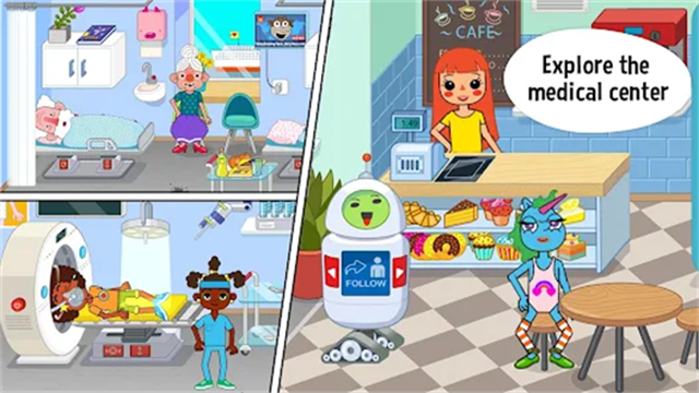 探索数十个可爱、有趣和独特的角色:人类、宠物、怪物、外星人和一个小新生儿。所有这些都在等着你!加入佩皮角色,探索医疗中心,在游戏中获得乐趣并创造自己的故事。