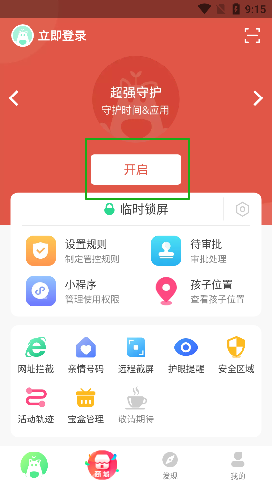 3、绑定成功后,点击开启你就可以使用这些功能【网址拦截、亲情号码、远程截屏、护眼提醒、安全区域等内容】