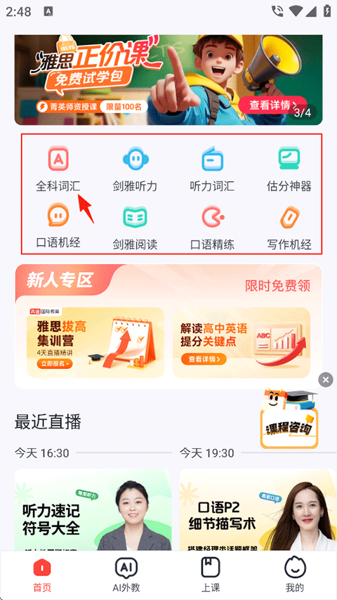 1、打开高途雅思官方版软件,点击首页-全科词汇;