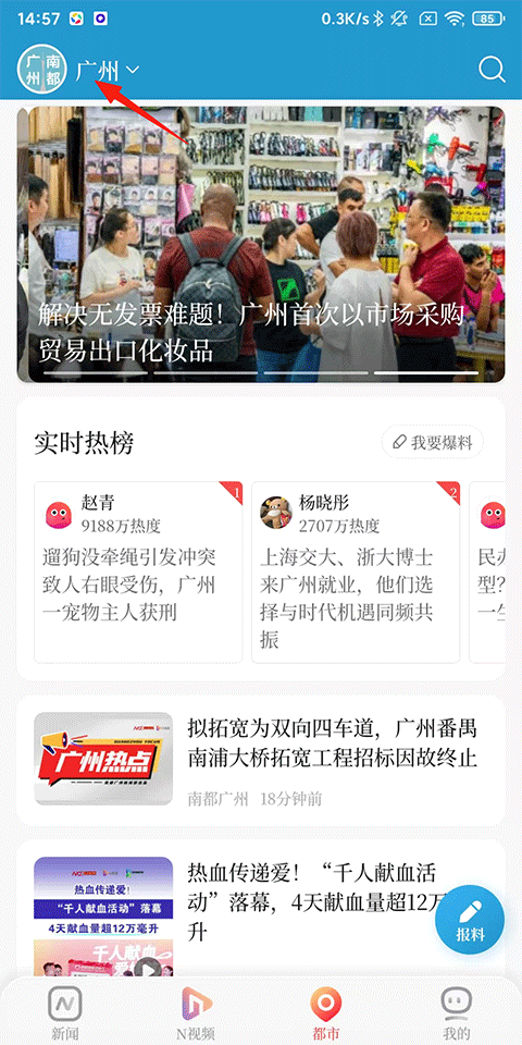 1、打开南方都市报手机客户端,在首页新闻页面可以浏览搜索感兴趣的新闻热点资讯;