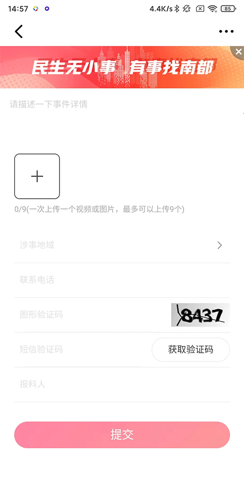 6、在输入框输入报料内容,上传图片等信息,点击提交完成报料。