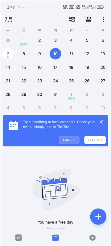 TickTick是一款私人化的事件管理器,比较适合学生党的,当然不仅限于学生党,界面非常的简洁,还有初级的日历视图。TickTick开始界面中会分为今日任务以及全部任务,用户可以随意设置两者之间的优先级,用户可以选择语音输入设置重要日程,比如生日、纪念日之类的,用户可以自定义设置提前几天提醒。TickTick还添加了非常多的中国特色化功能,比如农历,用户可以在清单上添加农历生日或者是其他重要日子的提醒,国外的日历是没有国家传统节日时放假的安排,但是中文版添加了这个功能,对于比较注重日程安排的小伙伴可以试一下这款软件。
