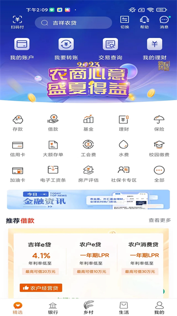1、打开天津农商银行手机银行客户端,在首页集成了我的账户、我要转账、交易查询、我的理财等主要功能,以及存款、借款、代销理财等子功能。