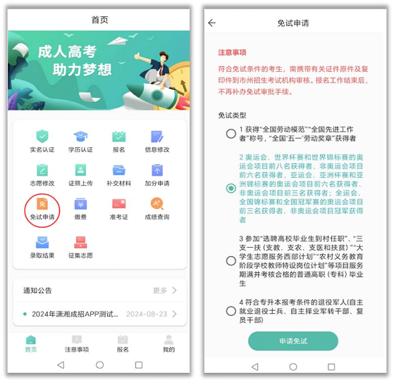 符合免试条件的考生可以通过 App 进行免试申请,申请后考生须持本人有效身份证件和相关证明到选定的市州、县市区招生考试机构报考点进行现场审核,报名工作结束后不再补办免试审批手续。