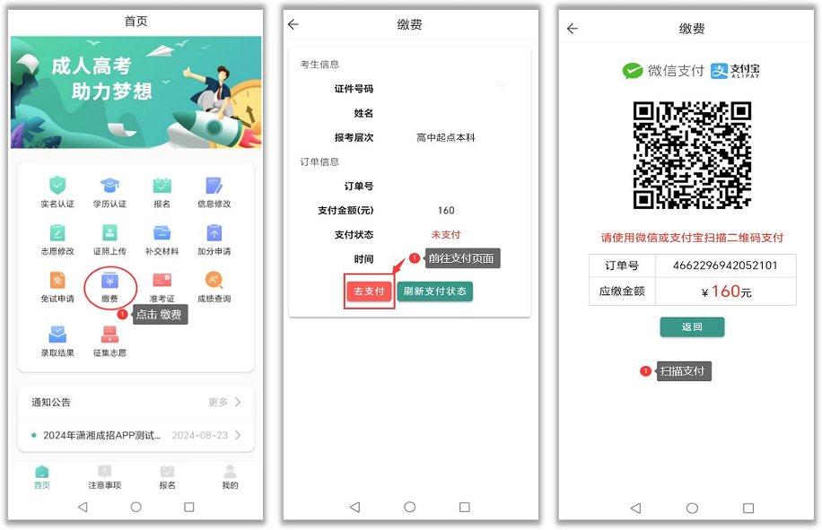 完成报名预约后且学历认证审核通过(针对报考专升本层次考生)、医卫类材料审核通过(针对报考医卫类专业考生)、证件照审核通过(针对全体考生)后可以通过 App 完成缴费。