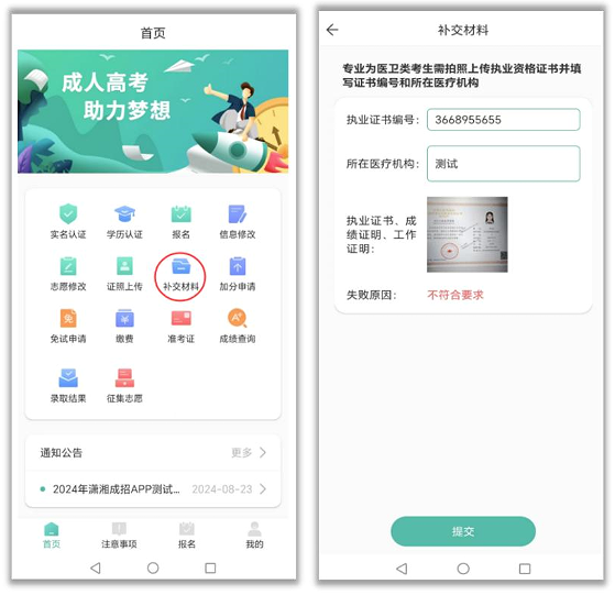 报考医卫类专业考生相关材料审核不通过时须通过补交材料功能重新上传材料。