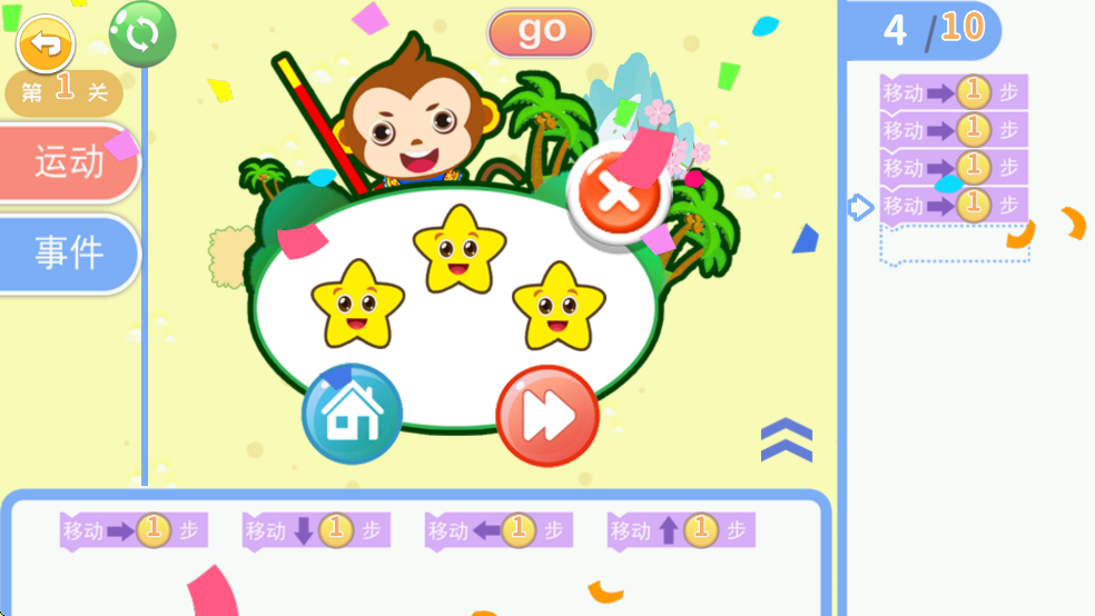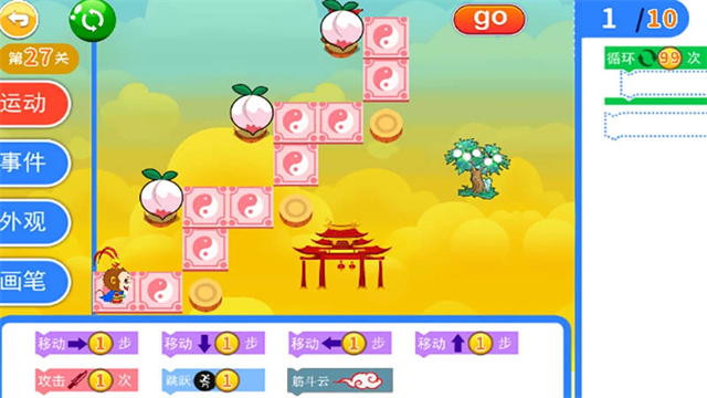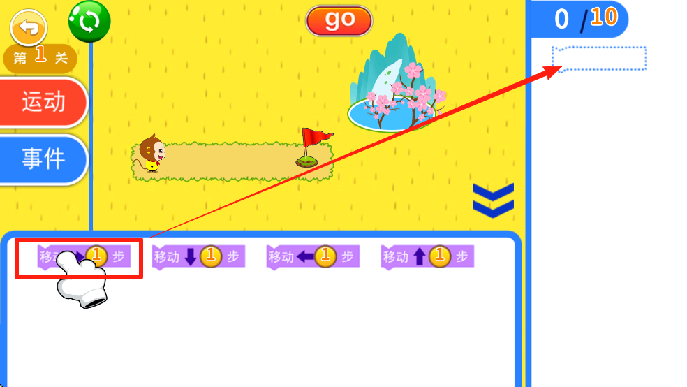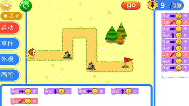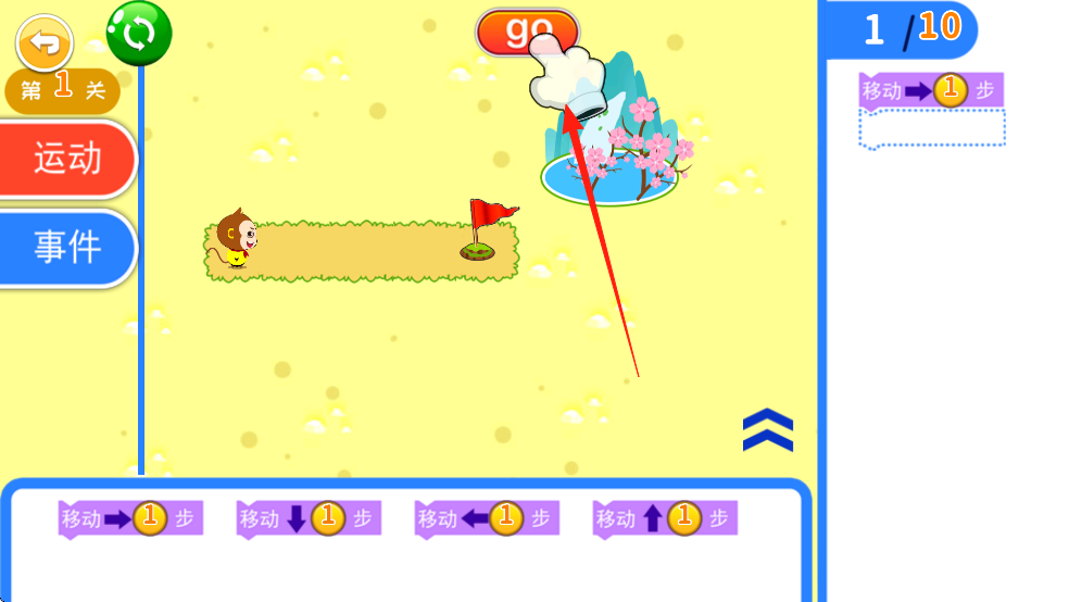 5、方块放置好后点击【go】,小悟空就会向前前进一步