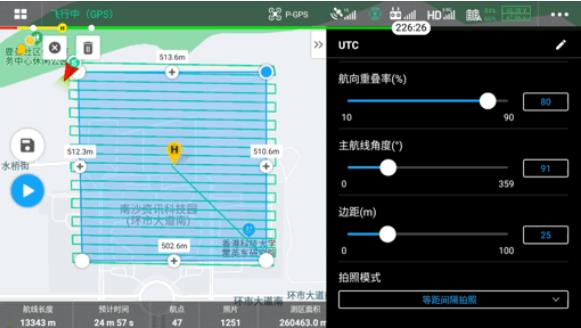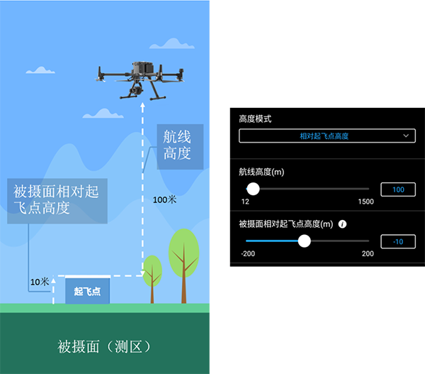 在航测作业中会根据任务要求的GSD设置作业高度,在高度模式选择相对起飞点高度时,先设置被摄面相对起飞点高度,再设置航线高度能更易设置所需高度。
