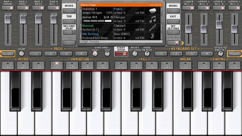 •模拟KORG键盘与:退色,同步,键盘设置,节奏,转置,八度,平衡,调整,分裂,和弦记忆,点击速度/重置…
